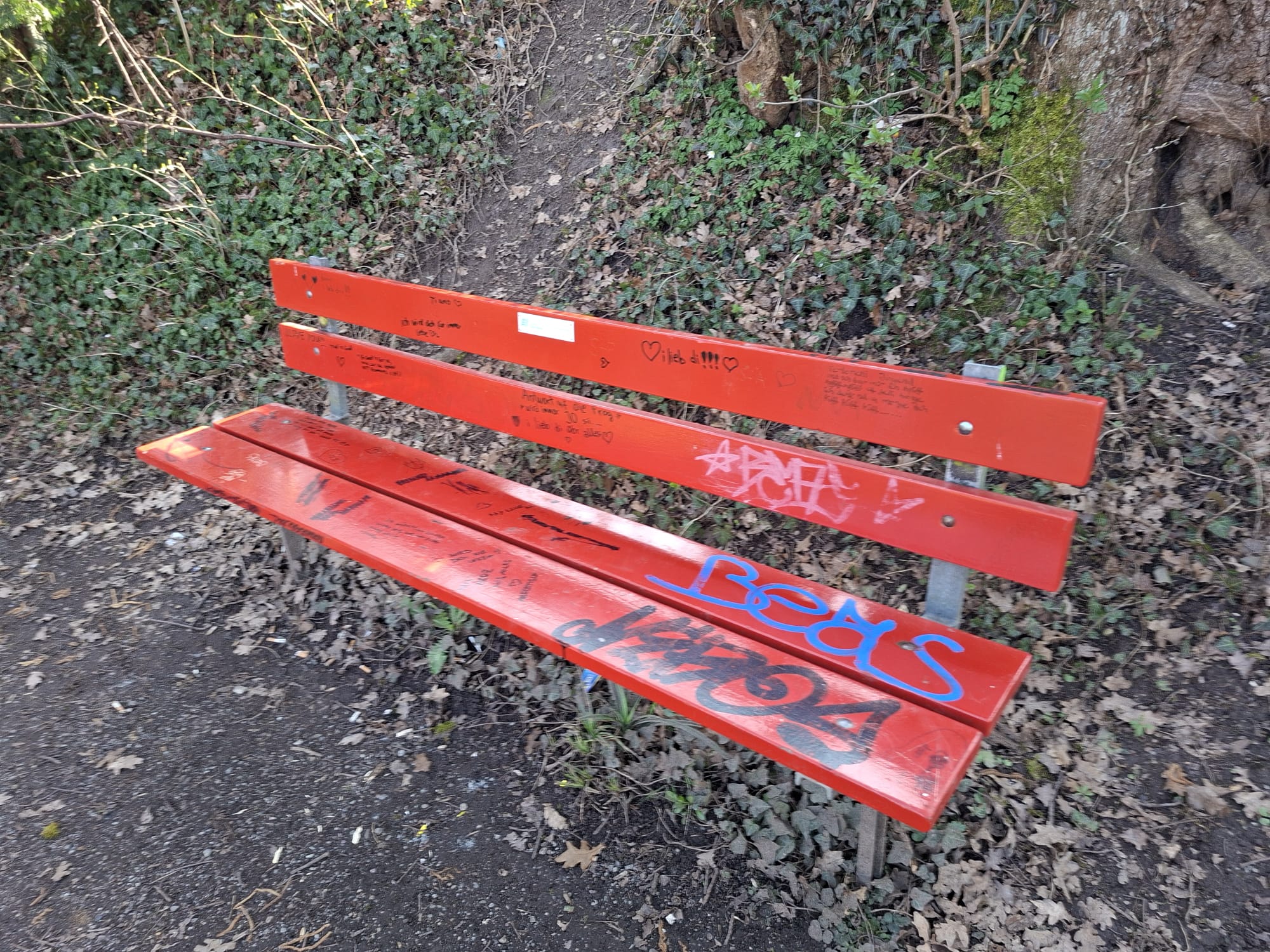 Juli 2025: Das rote Holzbänkli beim Pärkli Wiesen- / Haldenstrasse ist bei der Neugestaltung durch ein Metallbänkli ersetzt worden und lädt zum Verweilen ein.